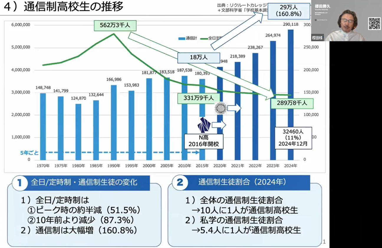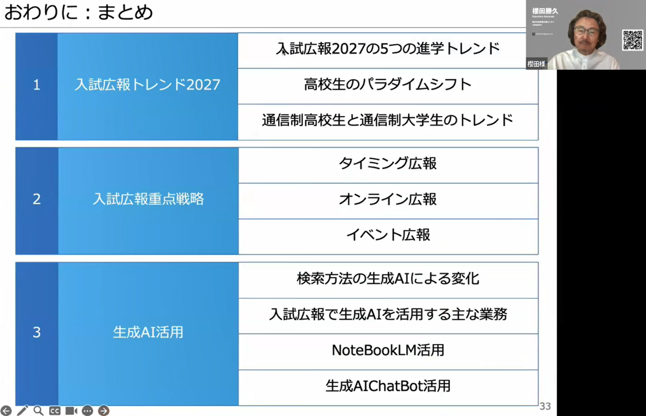 株式会社教育企画センター代表取締役:櫻田氏から、高校生の最新トレンド、通信制高校やオンライン大学の現況について、また、2027年度学生募集を成功に導くための戦略を解説いただきました。