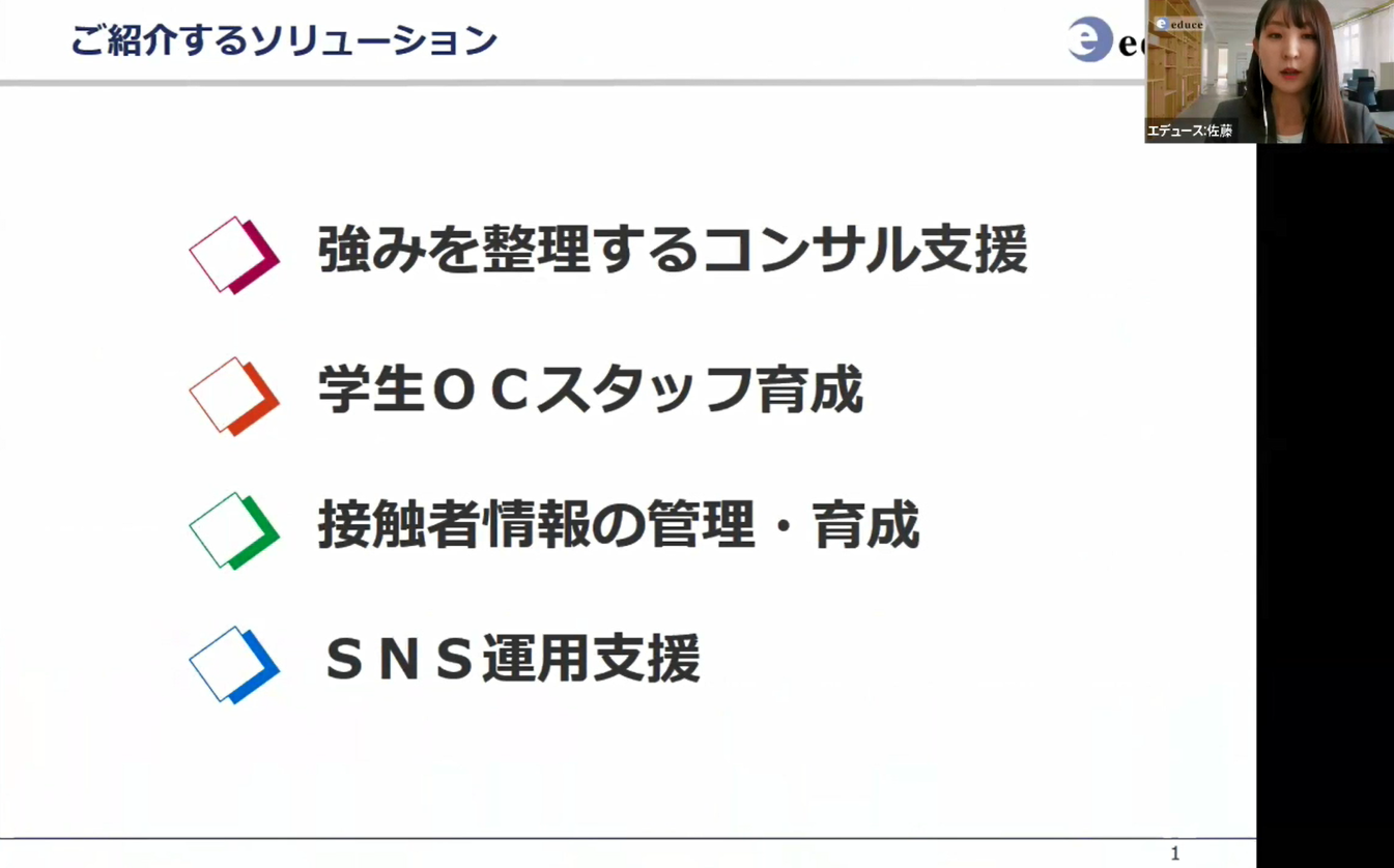 第2部では、エデュースの学生募集ソリューションの「コンサル支援」「学生OCスタッフ育成」「学生募集支援システム evo(接触者情報の管理・育成)」「SNS運用支援」を紹介させていただきました。