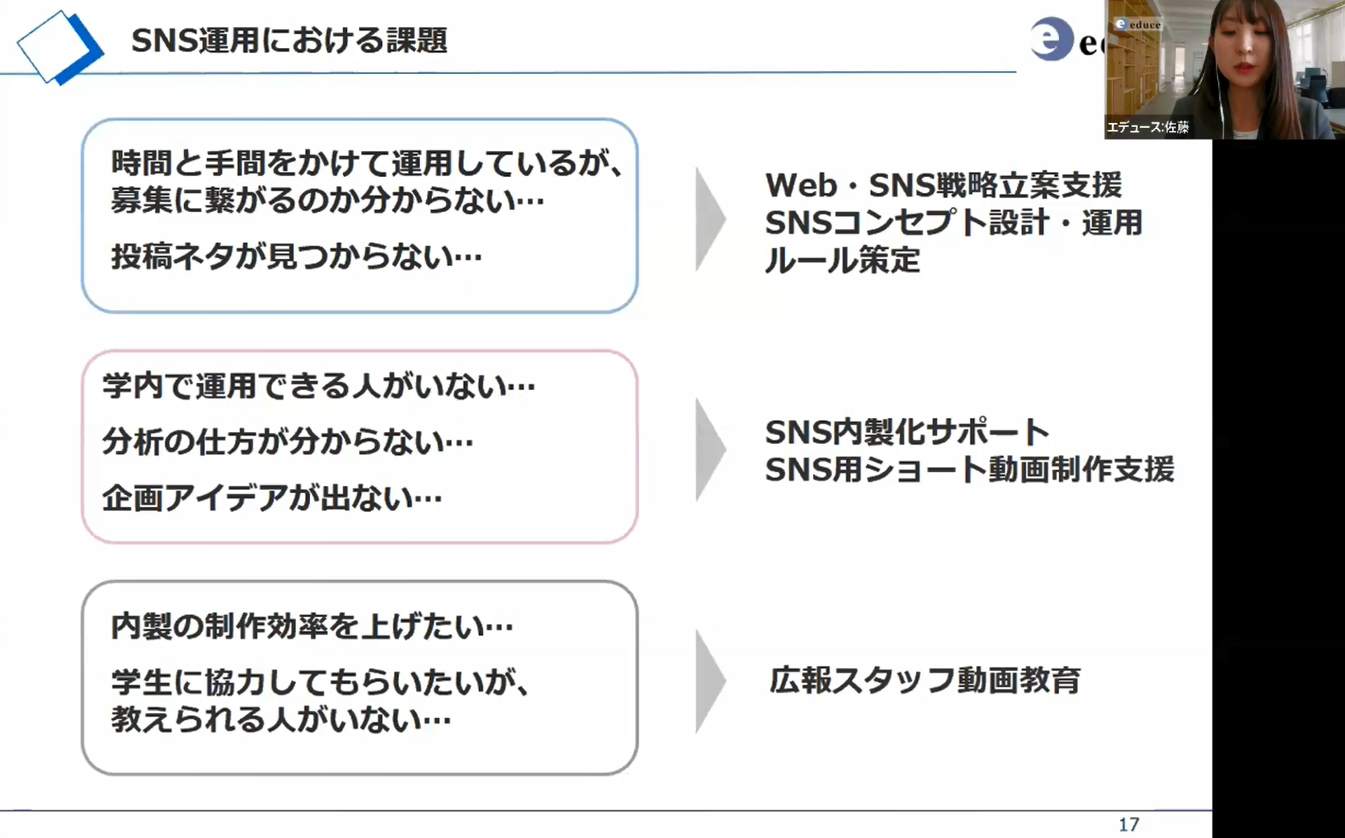 5月のセミナーでも説明しました「SNSの運用支援」について、多くの学校様が課題を抱えている点が、今回のアンケート結果から、あらためて窺うことができました。