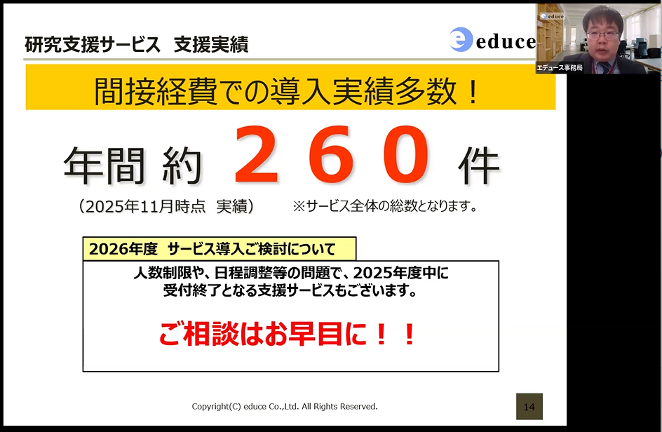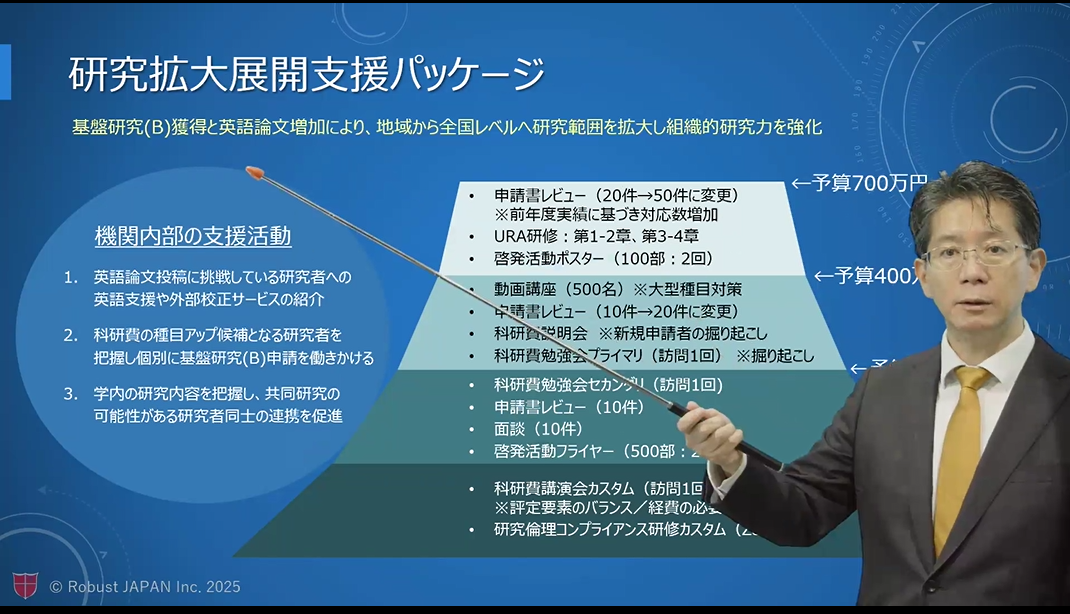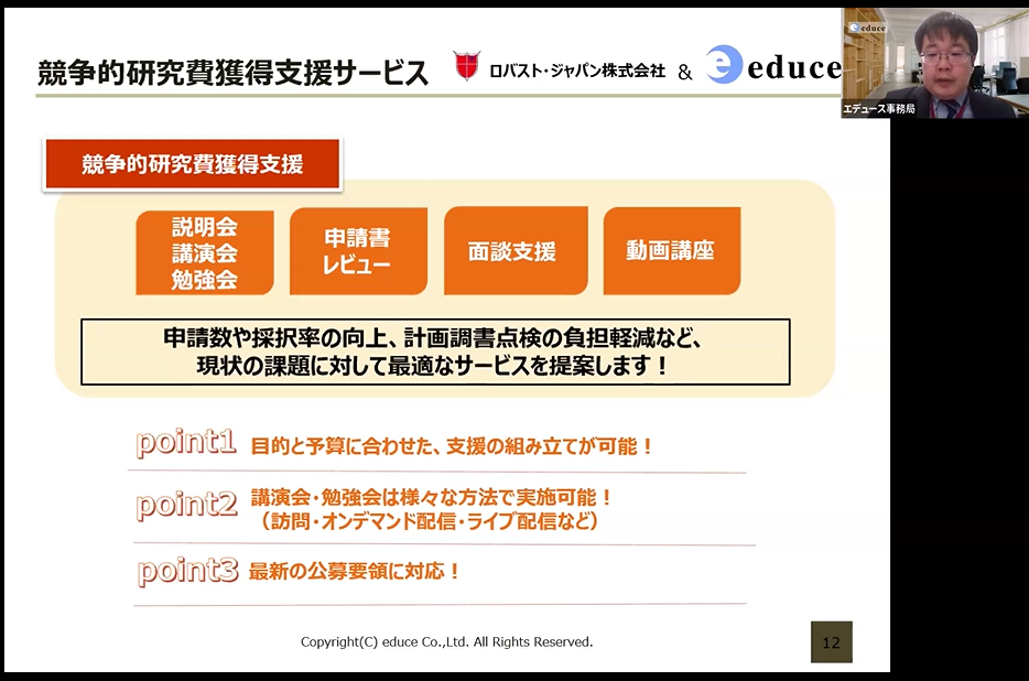 導入実績累計320校を突破したACOffice「科研費プロ」「研究業績プロ」をはじめ、学内の申請数、採択率アップに重点を置いた「科研費に関する各種セミナー」、専門家が研究計画書を添削する「申請書レビュー」、専門家とオンラインで会話しながら相談が可能な「面談支援」、いつでもどこでも最適な講座が閲覧可能な「動画講座」といった科研費の他、競争的資金獲得に最適なロバスト社が提供する科研費申請支援サービスについてご紹介いたしました。