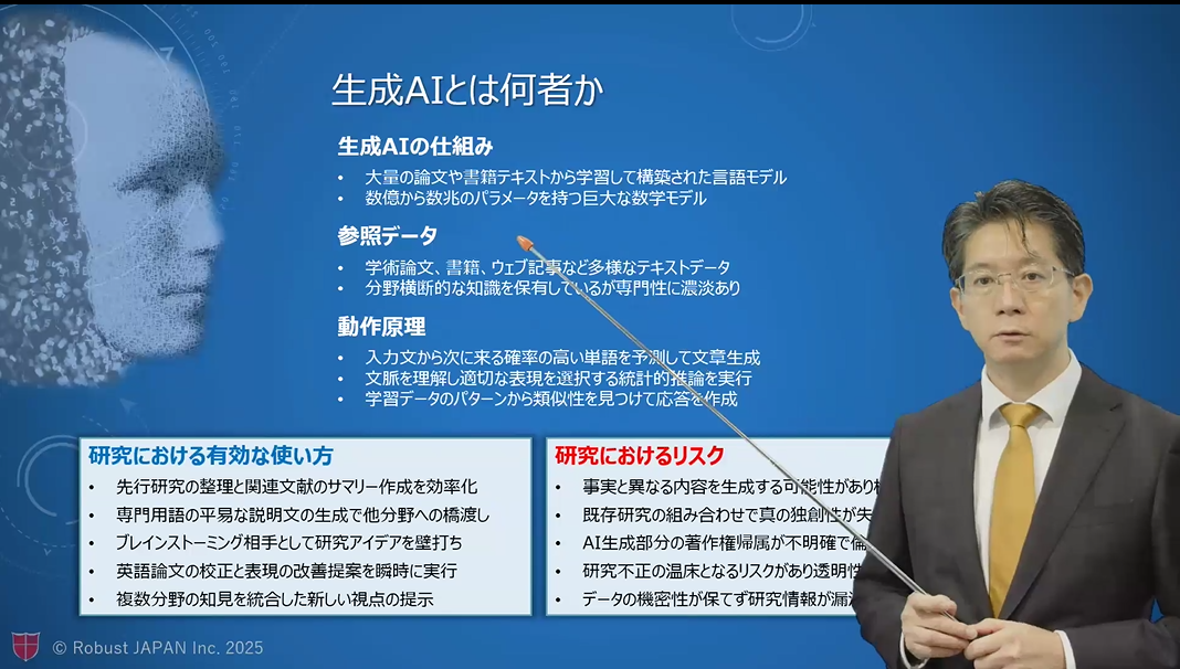生成AIの進化による研究活動の効率化とその裏側にある独創性の低下や機関としての倫理的リスクへの対応、また、自機関のデータに基づいた戦略的な支援が、いかに研究費の獲得や科研費の採択率向上に繋がるか等、事例を交えて解説いただきました。