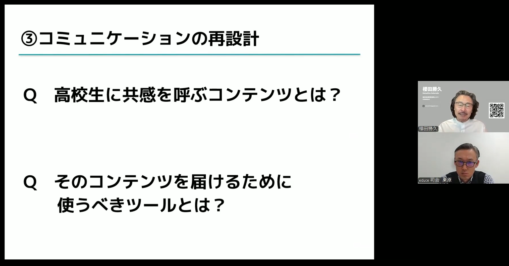 動画後半の櫻田様と弊社コンサルタントとのトークセッションでは、「ターゲットの再定義」や「コミュニケーションの再設計」といった募集広報のポイントについて、学校様からよくお伺いするお悩みを踏まえてさらに深堀りし、徹底解説していただきました。