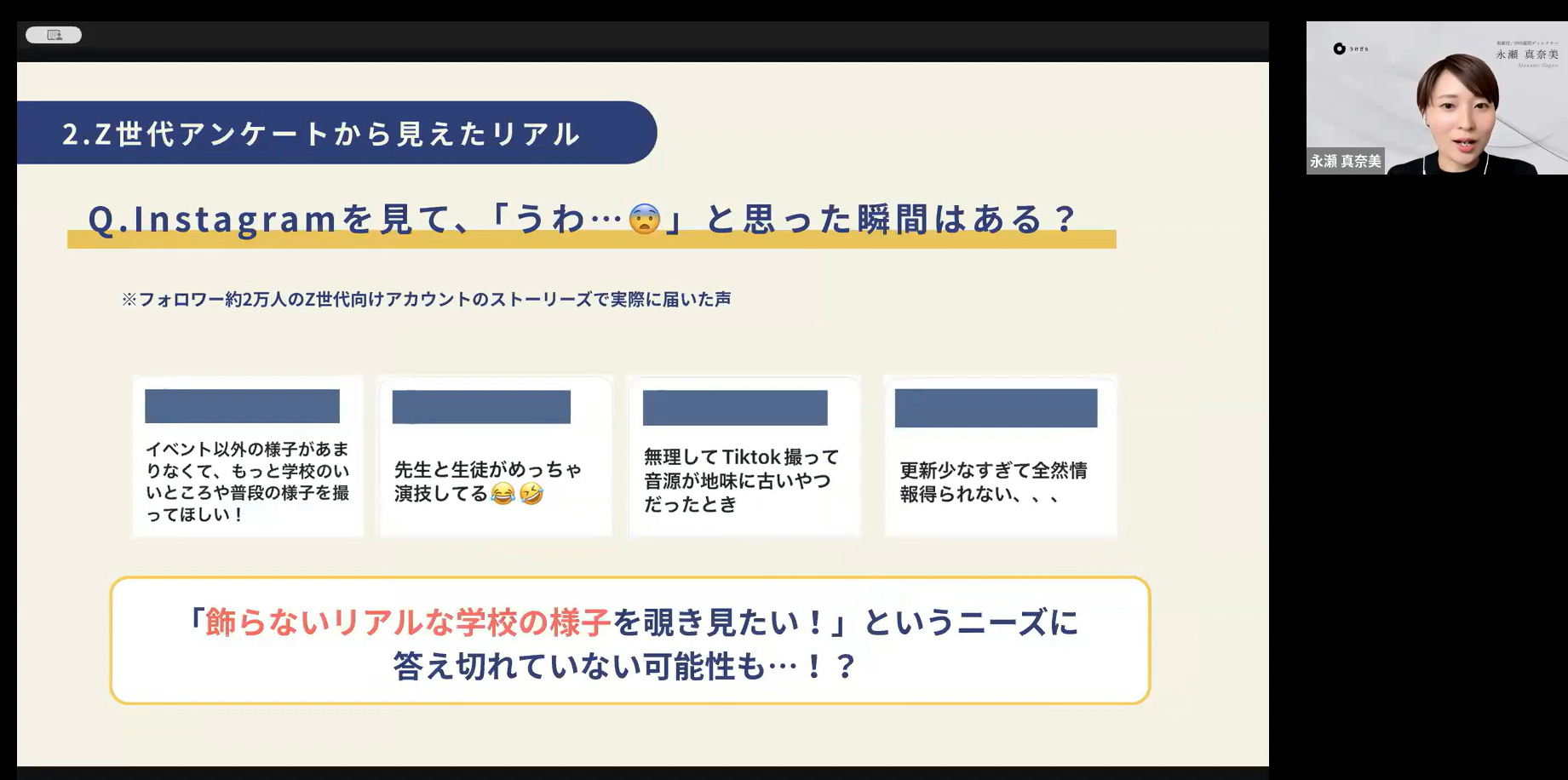 学校や企業のSNS運用支援、およびZ世代のユーザー向けInstagramアカウントを運営されている株式会社うけざらの永瀬様に、学校広報におけるSNS戦略設計の重要性を解説いただきました。